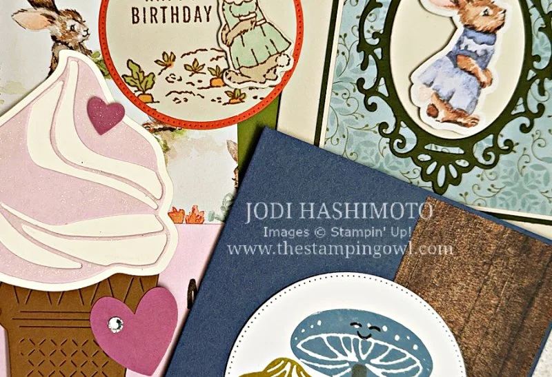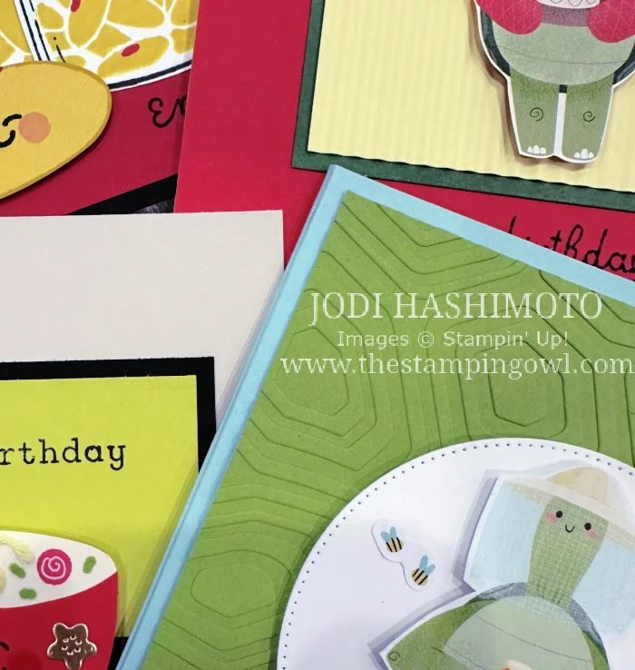 Here are the cards from my Jars & Shells class. They range from favorite treats to cute turtles. The stamp sets and products are from the Annual Catalog as well as On-line Exclusives. Recipes are included with each project and the supply details are listed at the end of this post. Thanks for stopping by!