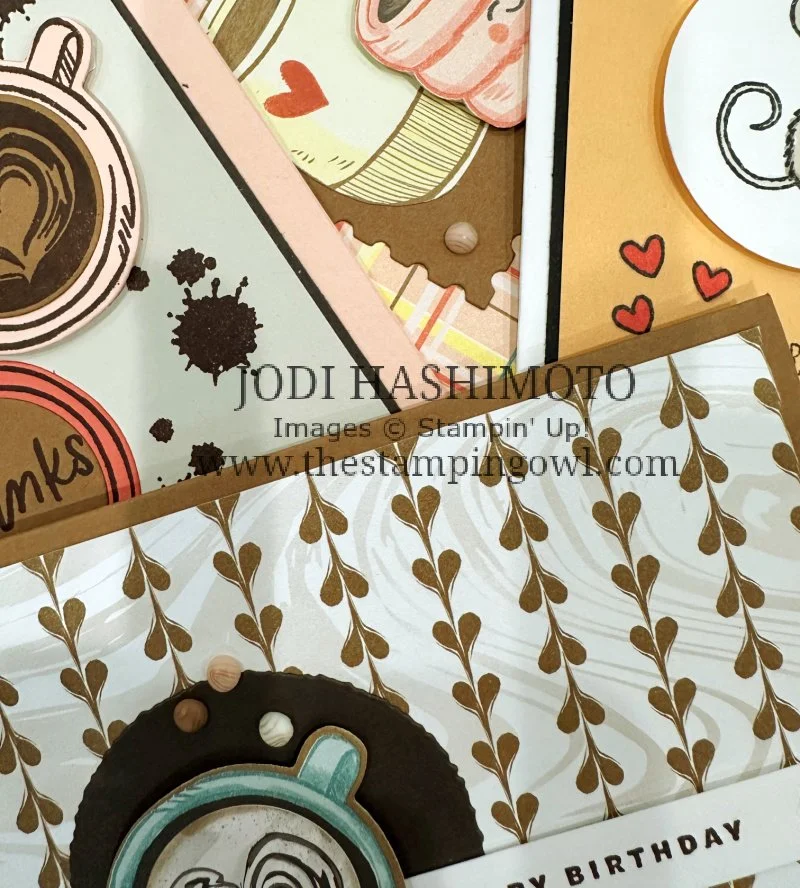 Here are the cards from my Latte Fun class. The stamp sets and products are from the new Annual Catalog and On-line Exclusives and will provide your caffeine fix. Recipes are included with each project and the supply details are listed at the end of this post. Thanks for stopping by!
