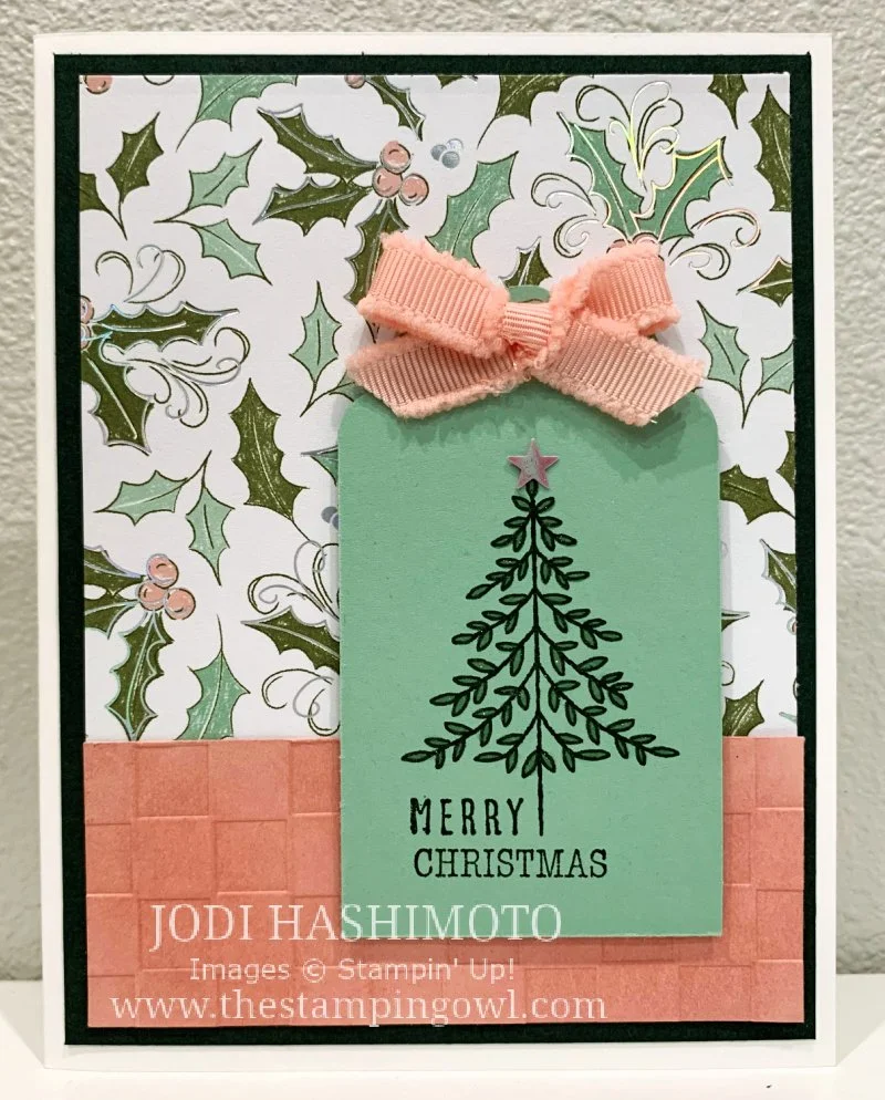 This little Christmas tree is highlighted on a tag that was made with the Delightful Tag Topper punch and topped with a bow made from the blushing bride 3/8” frayed grosgrain ribbon. The star at the top is a cute stars adhesive backed sequin, large size. The checked design at the bottom on the blushing bride cardstock was made using the Checks and Dots embossing folder then blushing bride ink was brushed on using a blending brush.