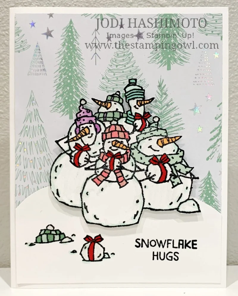 Because the snowman stamp is large, we used the Stamparatus to stamp the image onto a piece of white cardstock. Then the image was cut out and colored using Stampin’ Blends. The white hill of snow in the background was stamped with the hat, snowball and sentiment. The DSP piece was attached to the backing first, then the hill of snow, then the snowmen using dimensionals.