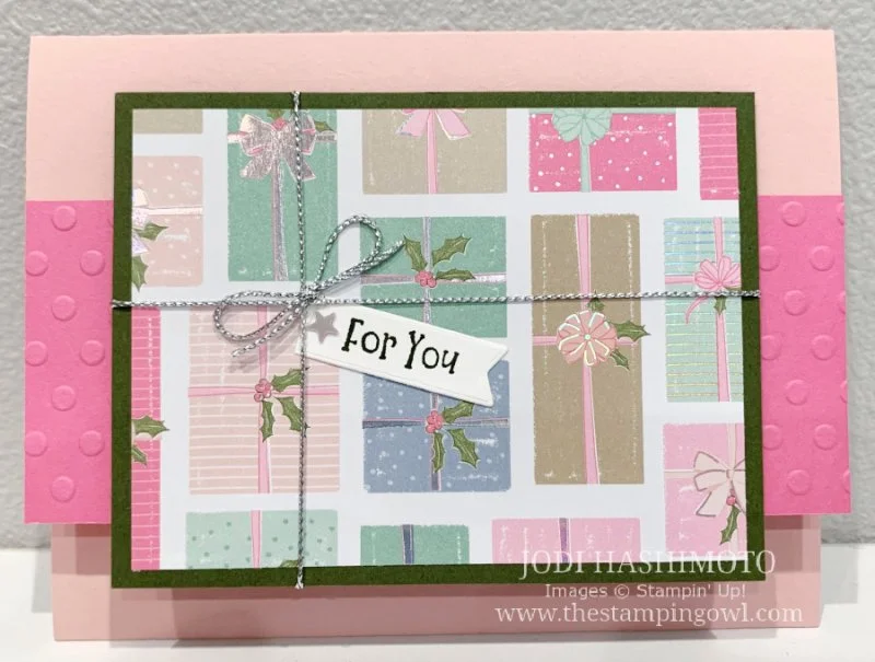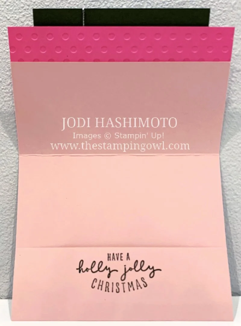 This card is a gift card holder that has an inner pocket. The blushing bride cardstock base was scored at 2 ½” and 6 ¾” along the 8 ½” edge. The inner pocket was made from the 1 ¾” flap. The photos below show the outside and inside views. The silver twine wrapped around the present were made using 2 pieces of twine, each 5” long. The edges were attached on the back of the cardstock using dimensionals, note that the bottom edge dimensional is hidden and secured above the edge of the cardstock. The polished pink band along the middle was embossed with the checks and dots embossing folder, then attached to the top flap so that it was positioned in the middle.