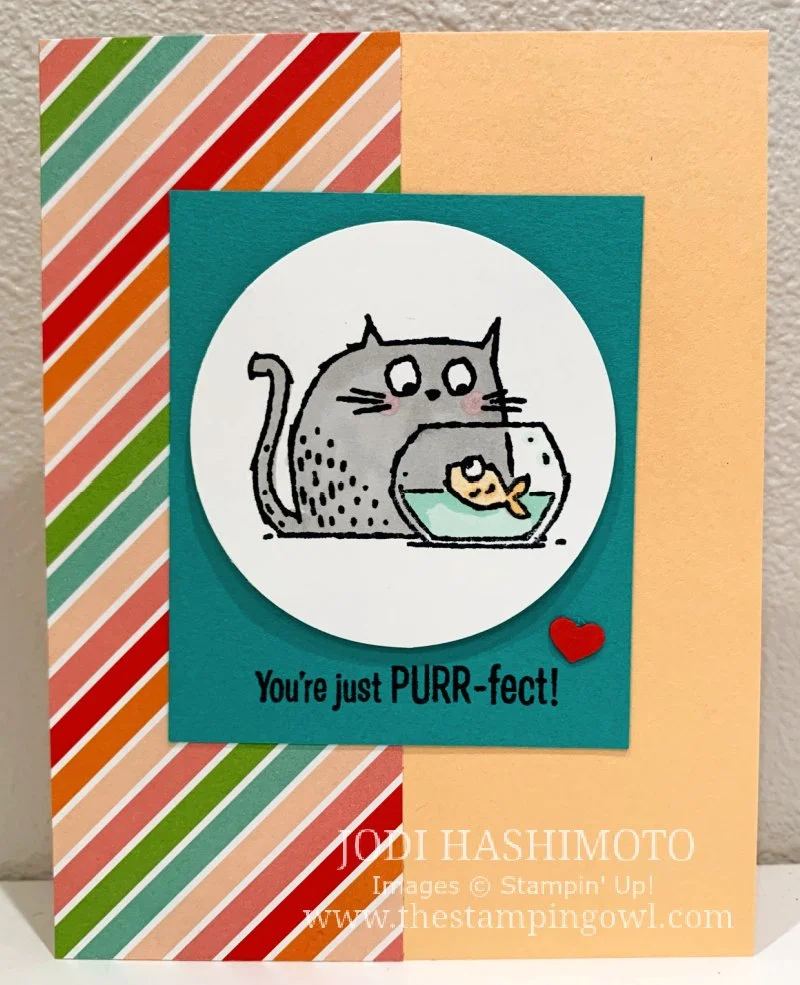 It’s a simple layout that can be done in many colorways. I decided to use the Pattern Party DSP with coordinating cardstock and inks. After coloring, I accented the fish with Wink of Stella Clear.