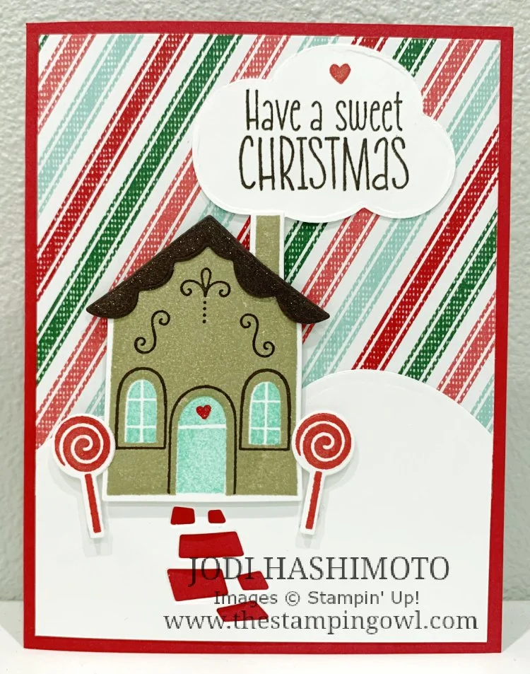 This card features the Sweet Gingerbread bundle and Sweetest Christmas DSP to create a sweet holiday scene. The house was stamped on Basic White cardstock in Crumb Cake ink, then windows in Pool Party ink, then designs door/window outlines in Early Espresso ink. It was then die cut along with the roof scalloped edge in Early Espresso cardstock. The snow hill background and steps, smoke cloud and lollipops (stamped in Real Red first) were die cut as well. The Sweet Gingerbread has more cute images and coordinating dies to create many different house, such as a wreath, gumdrops, trees and heart.