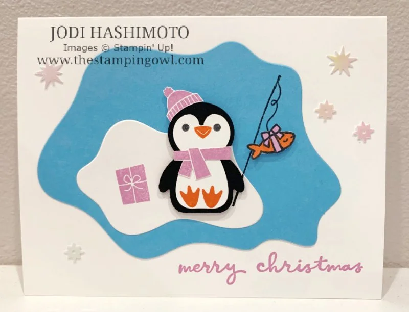 This cute little penguin is fishing for holiday gifts. The fish is from the Party Puffins stamp set. The rest of the images are from the Penguin Place stamp set. For the water and ice patch, the Layering Diorama dies were used. I decided to use Fresh Freesia as the accent color (hat, scarf, present, words) to pick up on the lavender/pink shimmer on the adhesive snowflakes.