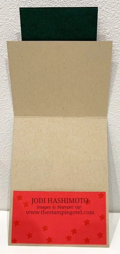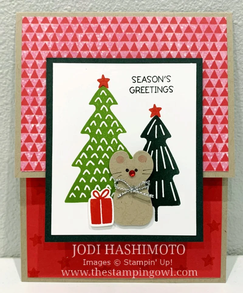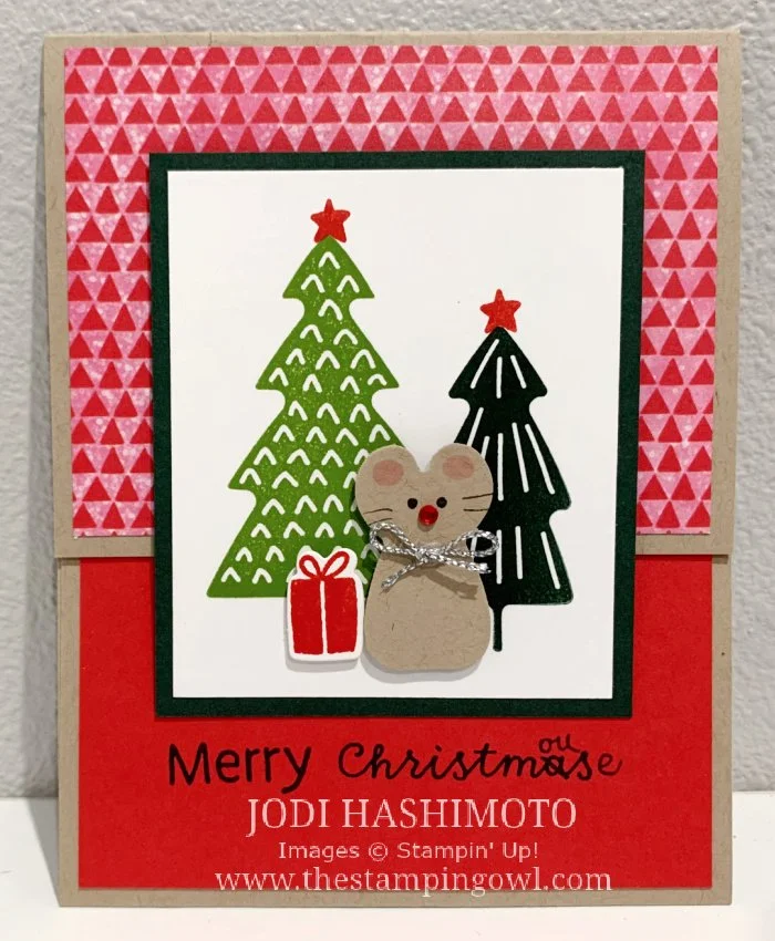 This cute little mouse is ready for the night before Christmas. It was punched from the Penguin Builder punch. Then the eyes and whiskers were drawn with a black marker, ears with a pink marker, and a red rhinestone nose. He’s standing by a present and in front of trees from the Spruced Up stamp set. This is a pocket card so you can include a gift card, packet of tea or other similar item. The photo below shows 2 options for sentiments—my favorite being the handwritten modification to “merry christmouse”.