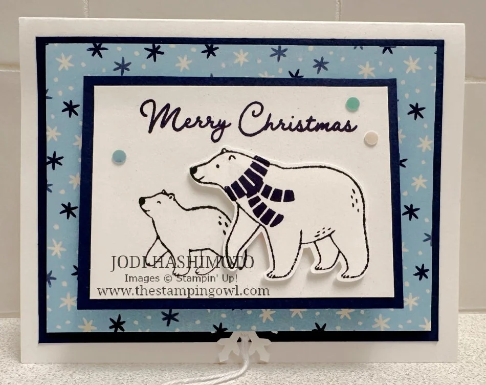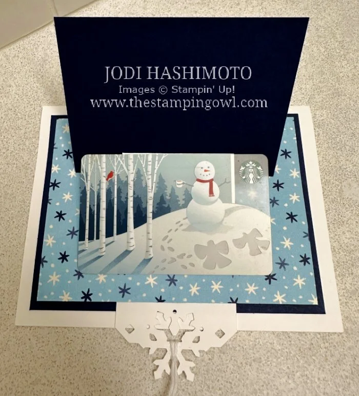 This pair of polar bears are on top of a fold up flap that you can attach a gift card to. Just pull the white bakers twine and snowflake tab on the bottom to reveal the surprise. Thanks to Dawn Griffith for teaching me how to do this. You can check out her video here (it’s card #2) to see how she made her card. Instead of using a die to create the tab slit, I used a 1/8" circle punch to mark each end and then cut a slit between the holes using my paper trimmer. See photo.