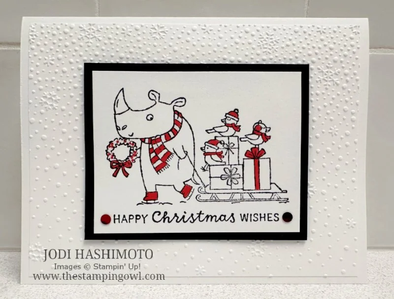 This cute rhino is delivering gifts along with his feathered friends. Instead of coloring the entire image, I chose to feature one color to make the image pop, which was Real Red. It also highlights the feeling of snow along with the background being embossed with the Snowflake Sky 3D embossing folder. For additional shimmer, I colored over the red with Wink of Stella.
