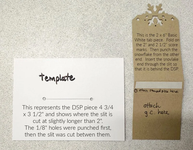 2 x 6” scored at 2” and 2 ½” on 6” end for the tab pull; punch the end that is not scored using the Sparkling Snowflakes Tag Topper