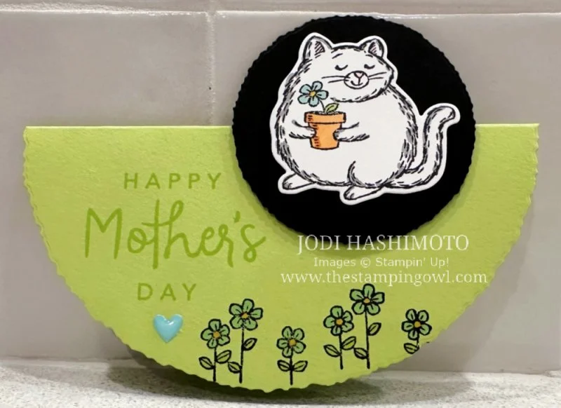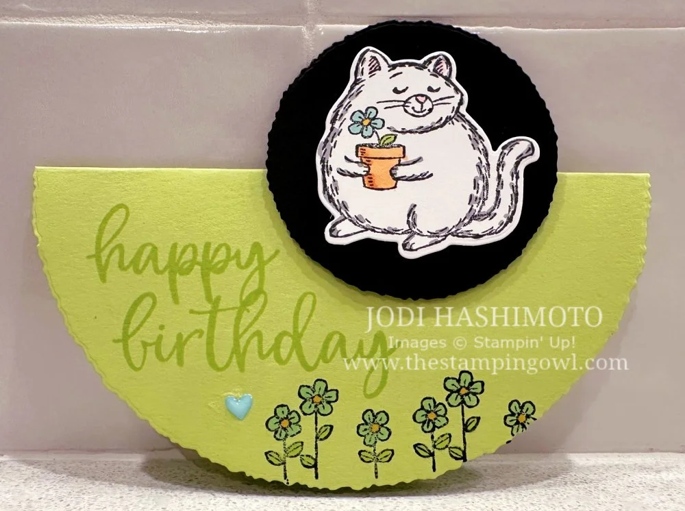 This is a rocker card. You may have seen them being made with various circle dies--this one uses Deckled Circles. They are fun to stand up on your table or desk and tap on the end to rock. Because the cat is mounted slightly to the right, the card at rest leans slightly to the right. You can adjust to the center by using a smaller sentiment.