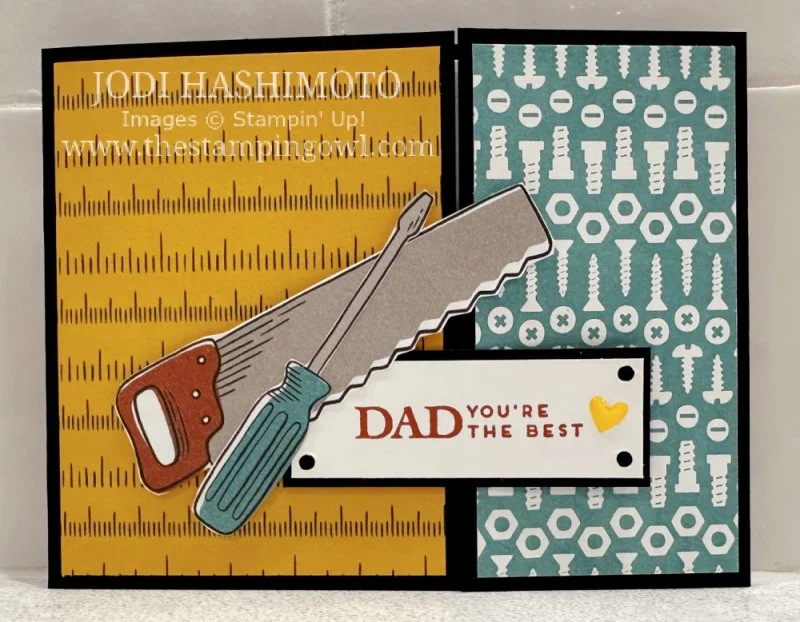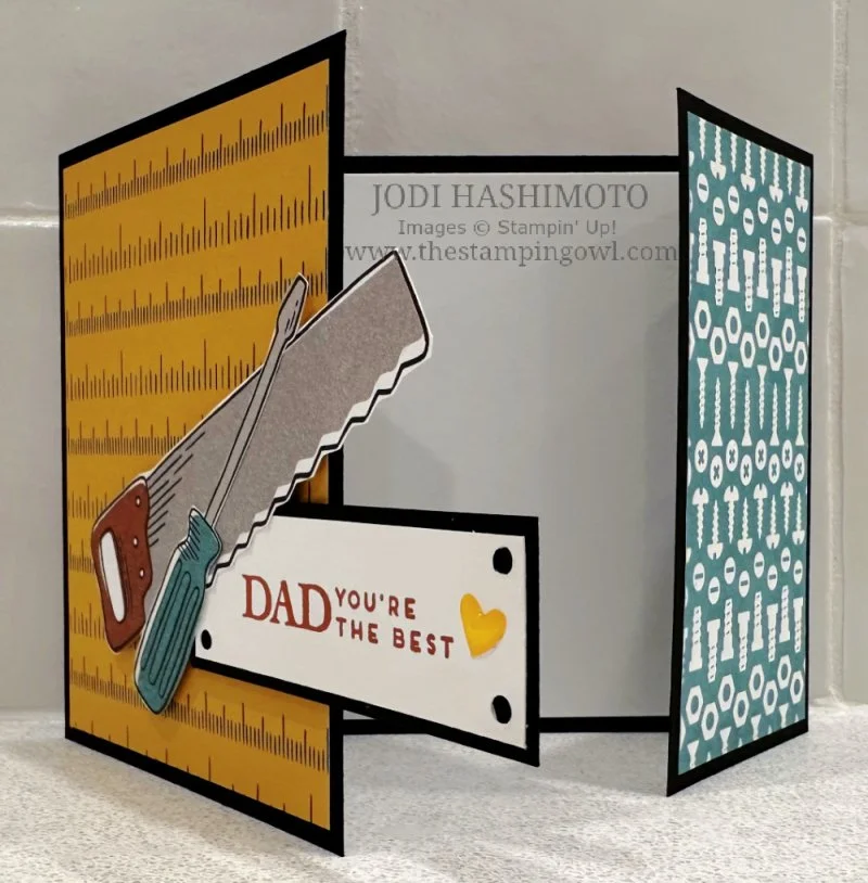 Here is a card for the guys. This sample is for father’s day, but it can easily be made for a birthday, retirement, thank you, or other occasion by just swapping out the sentiment. The tools were cutout from paper included in the Trusty Toolbox DSP. This is a panel card, with the left being 3 ¼” wide and the right 2 ¼” wide. Photos of the front and opened card are shown below.