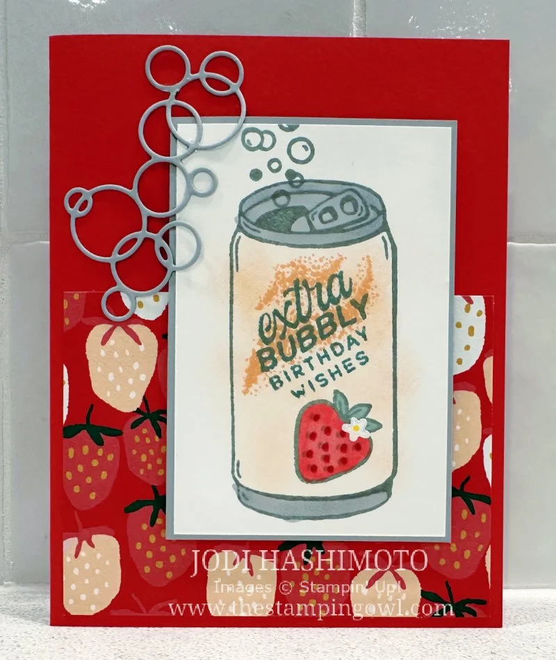 The Simply Sparkling stamp set available through on-line exclusives includes all of the stamps that were used on these cards. I used the strawberry and cherries, but there are more fruits in the set too. The bubbles were made from the coordinating dies and you will see more of the cool shapes in one of the cards for March’s class.