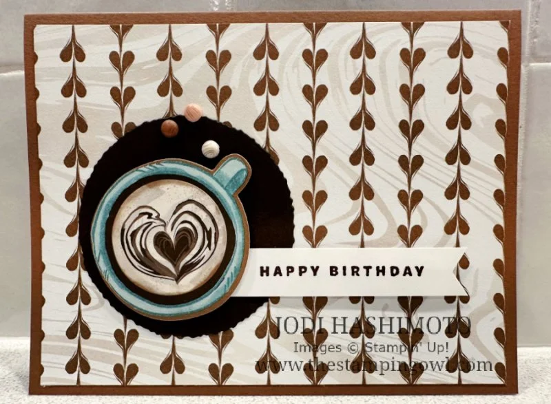 This card features the A Little Latte designer series paper and coordinating dies. The cup of latte was die cut from the DSP using the appropriate Latte Love die. Then the plate it is resting on is the 2 ½” size circle from the Deckled Circles dies. The three drops are adhesive backed swirl dots that are part of the Latte suite.