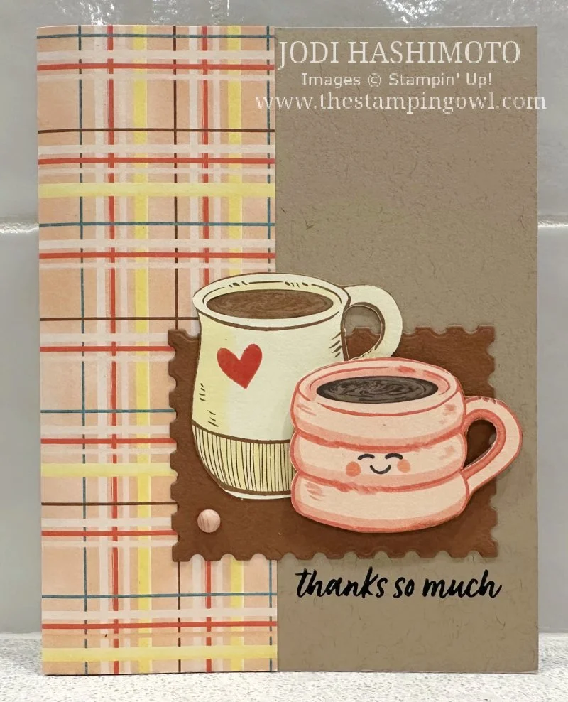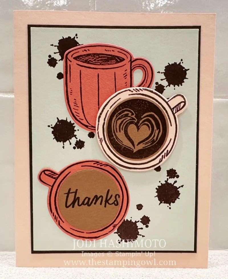 This card was made using stamped images only, no DSP. All of the images are from the Latte Love stamp set and die cut using the coordinate dies. The sentiment was selected so that it would fit within the liquid circle of the mug and is from the Simply Said stamp set.