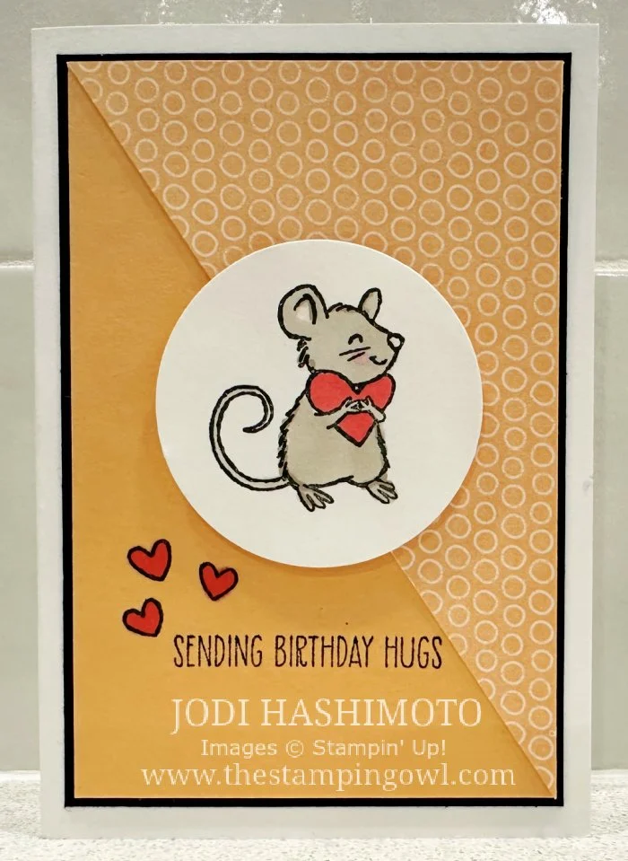 Of course I needed to include a critter card! This cute mouse is from the Hearts & Hugs stamp set on a Basic White notecard featuring the new 2024-2026 In Colors. The class pack has an assortment of colors (Peach Pie, Pretty in Pink, Petunia Pop). Cutting the DSP along the diagonal was an idea inspired by a talented demonstrator and friend, Zeny Lucey (thanks Zeny!).