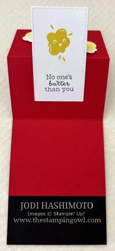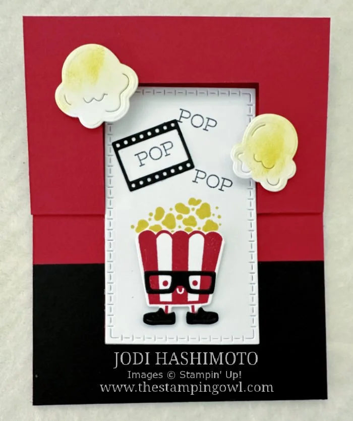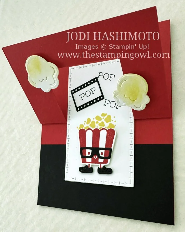 When I saw this popcorn bag with the glasses and shoes I had to have it. So cute! This card is based on a design and fancy fold card from another SUI demonstrator, Laura Milligan. Thank you for the inspiration!