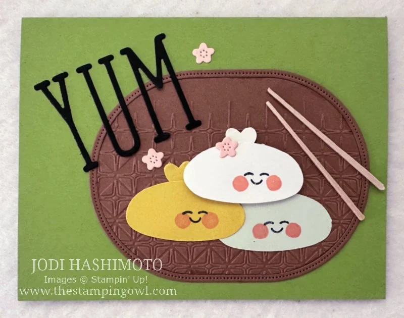 I’ve been playing with the shapes from the Terrific Toadstools punch and the oval mushroom top first reminded me of mochi ice cream then dim sum. Once I figured this out, I knew I had to create a card of dim sum. The top of the dim sum is the small heart from the Bee Builder Punch. The face was stamped using one of the faces from the Bee My Valentine stamp set and cheeks stamped using an eraser top in Petal Pink ink. For the plate, I wanted it to look like a basket, so I used the dotted outline from the oval die cut in the first card, plus the oval itself, embossed using the glass design from the Glass & Gardens embossing folder. The chopsticks are toothpicks. Enjoy!