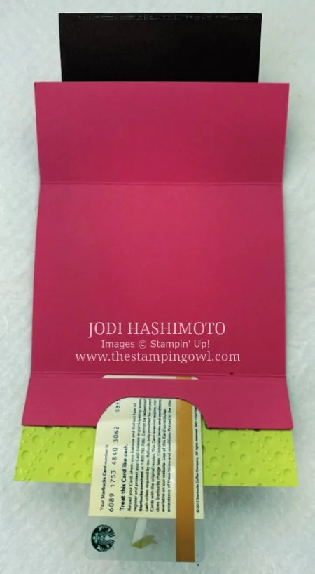 Here are more flowers that were made from the Impressions Abloom stamp set. Use 2-step stamping to create the layered effect. The main color was Pretty in Pink and the accent color was Strawberry Slush. The centers were punched ½” circles. Because I wanted to make this a happy card, I stamped faces on the centers. The faces are from the retired Taco Fiesta stamp set. This card can also hold a gift card. The holder was created by folding on the 1” line, attaching the left edges with liquid glue, then punching through 2 layers on the center of the outer edge using the Modern Oval Punch.
