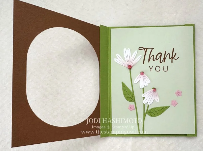 Here is the feature card for today’s class that encompasses the theme—it has flowers and pink gems for flair. The combination of the soft pinks, greens and pecan is fresh and pretty. The window is cut from the oval die that includes a narrow border from the Impressions Abloom dies. We saved these pieces to use in the next card.