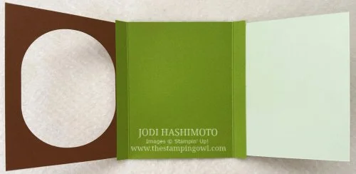 Granny Apple Green cardstock base, 5 ½ x 5 ¼”, scored at ½” and 4 ¾” along the 5 ¼” side, plus piece to die cut stems and leaves