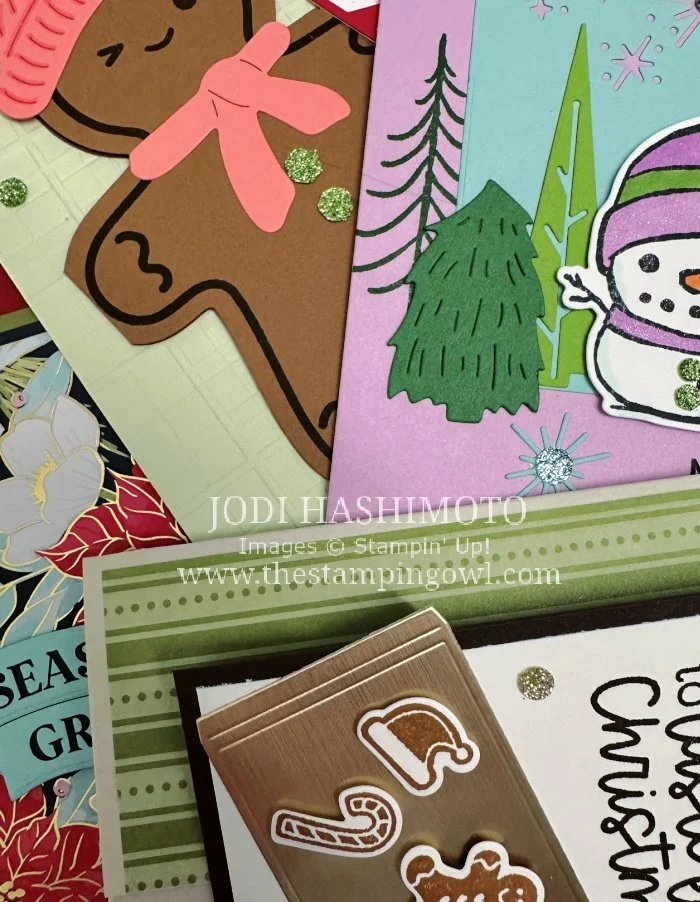Hi friends! Hope you can join me this month for our annual holiday class with snowmen, santa, elves, gingerbreads cookies, and winter florals. Here is a sneak peek of the class cards: